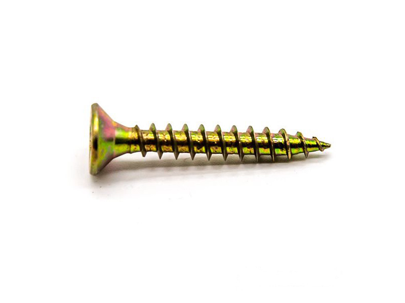 Spanplattenschrauben mit Senkkopf und Torx-Antrieb, mit Voll- oder Teilgewinde, mit gelber oder weißer verzinkter Oberfläche.