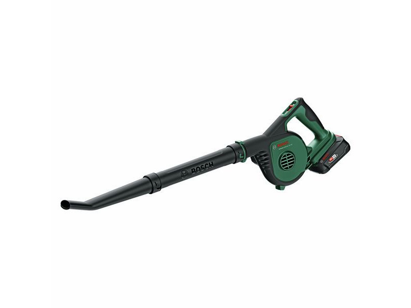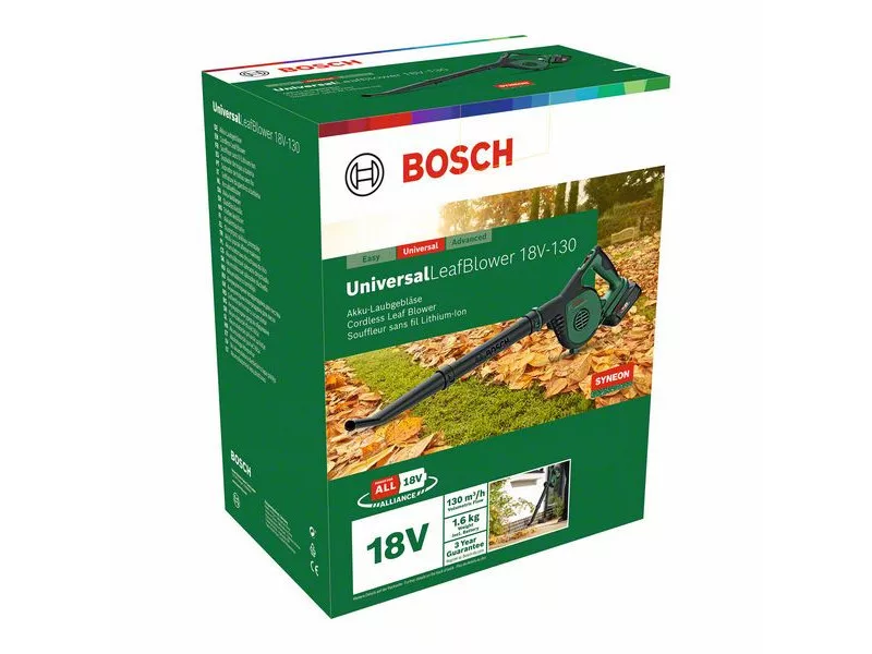 Sammeln Sie Gartenabfälle mühelos mit dem akkubetriebenen UniversalLeafBlower 18V-130! Der leichte und kompakte Laubbläser hat einen ergonomischen Griff und lässt sich problemlos in die entferntesten Ecken des Gartens transportieren. Er verfügt über einen einfachen, zweistufigen Schalter, mit dem der Luftstrom von hoher Leistung auf gezielte Reinigung umgeschaltet werden kann. Der Bosch 18V POWER FOR ALL Akku und die Syneon-Technologie sorgen zusammen für eine beeindruckende Luftströmungsgeschwindigkeit von 245 km/h und hohe Leistung. Mit verschiedenen Blaseraufsätzen ist er vielseitig und flexibel für die Gartenreinigung einsetzbar. Der einfach zu montierende und kompakt zu lagernde Laubbläser kann im voll aufgeladenen Zustand bis zu 18 Minuten lang betrieben werden. Die integrierte Bosch Syneon Electronic schützt das Werkzeug und den Akku. Dieses Werkzeug ist Teil des 18V POWER FOR ALL ALLIANCE Systems. Ein Akku für alle 18V POWER FOR ALL Werkzeuge-