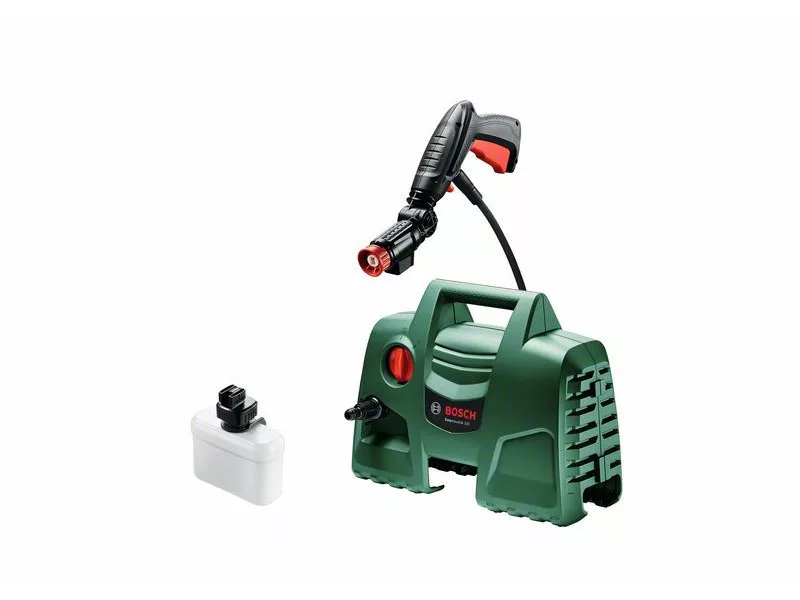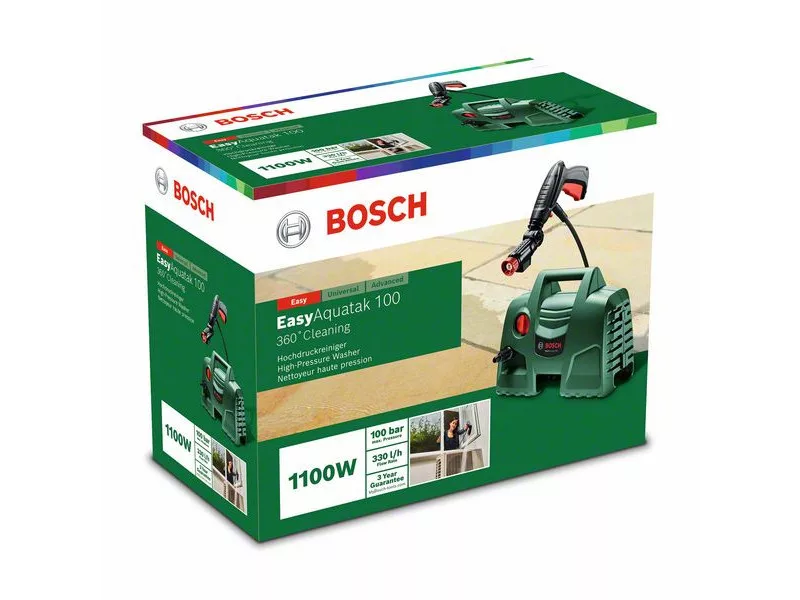 Ez a magasnyomású mosó praktikus megoldást nyújt a szennyezett felületek rendszeres tisztításához. A Bosch 360°-os szórópisztollyal egyszerűen tisztíthatók a nehezen hozzáférhető helyek. Az egykezes működtetés nagyobb szabadságot és kezelhetőséget nyújt a gyorsabb eredmények érdekében. Emellett a lapos vízsugár erőssége a feladatnak megfelelően az erőteljes sugártól a finom öblítésig állítható. Az EasyAquatak 100 használható autók, szemeteskukák, kerti bútorok és ablakok tisztítására. Magasnyomású tisztítószer-adagoló fúvókával is rendelkezik, amely a vízsugárral együtt adagolja a tisztítószert az alapos tisztítás érdekében-