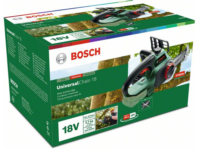 Die UniversalChain 18 ist leicht, kompakt und gut zu steuern für effizientes und kontrolliertes Schneiden - ihr Gewicht beträgt einschließlich Akku nur 3 kg. Mit dem Bosch SDS-System lassen sich Einstellungen einfach und werkzeuglos vornehmen. Der Stabilisator-Klingenabdeckungsgriff sorgt für einen sicheren Halt - dies ermöglicht eine bessere Kontrolle bei Unterschnitten und minimiert Astschäden. Einfacher Wechsel zwischen verschiedenen Aufgaben wie Feinschnitt, Abfallentsorgung und Brennholzherstellung. Dieses Werkzeug ist Teil des POWER FOR ALL ALLIANCE Systems. Mit nur einem Akku können eine Vielzahl von Werkzeugen verschiedener Marken betrieben werden.