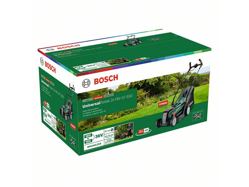 Der akkubetriebene UniversalRotak 2x18V-37-550 Rasenmäher überzeugt mit seiner Leistung und einfachen Handhabung. Er ist ideal für das Mähen von hohem und niedrigem Gras auf mittelgroßen und größeren Rasenflächen dank der Kombination von 36 V (2 x 18 V) Elektronik und bürstenlosem Motor, der eine hervorragende Mähleistung und eine längere Lebensdauer gewährleistet. Der Rasenmäher hat eine Schnittbreite von 37 cm, die Schnitthöhe kann einfach zwischen 25 mm und 70 mm mit der zentralen, 5-stufigen Hebelhöhenverstellung eingestellt werden. Hobbygärtner werden die Ergoflex-Griffe und den faltbaren 40-Liter-Stoffsack schätzen, der das geschnittene Gras während des Betriebs des Rasenmähers sammelt, sowie den eingebauten Füllstandsanzeiger des Fangsacks, der dem Benutzer anzeigt, wenn der Sack voll ist. Die eingebaute Bosch Syneon-Technologie sorgt für optimale Leistung bei maximaler Betriebszeit. Dieses Werkzeug ist Teil des 18V POWER FOR ALL ALLIANCE Systems.