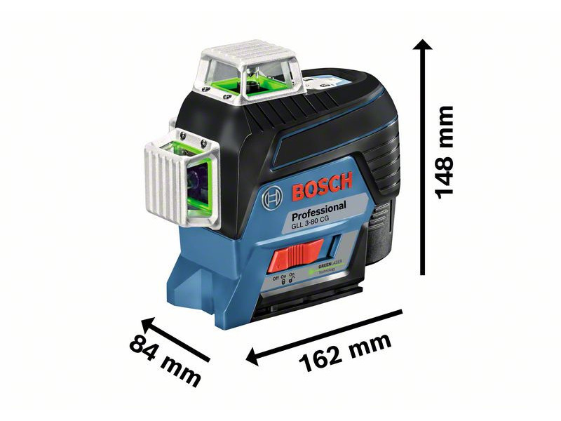 Der GLL 3-80 CG Professional ermöglicht durch seine Technologie die Nutzung von zwei unterschiedlichen Stromquellen, er kann sowohl mit einem 12V Lithium-Ionen-Akku als auch mit herkömmlichen Alkalibatterien betrieben werden - für maximale Flexibilität. Er führt eine Selbstnivellierung auf bis zu +/- 4° unebenen Oberflächen in weniger als 4 Sekunden durch, mit ausgezeichneter Genauigkeit von ± 0,2 mm/m*/**. Mit dem optionalen LR 7 Professional Empfänger beträgt seine Arbeitsreichweite bis zu 120 m. Kompakter, einfach zu bedienender und extrem robuster (IP54***) Linienlaser.