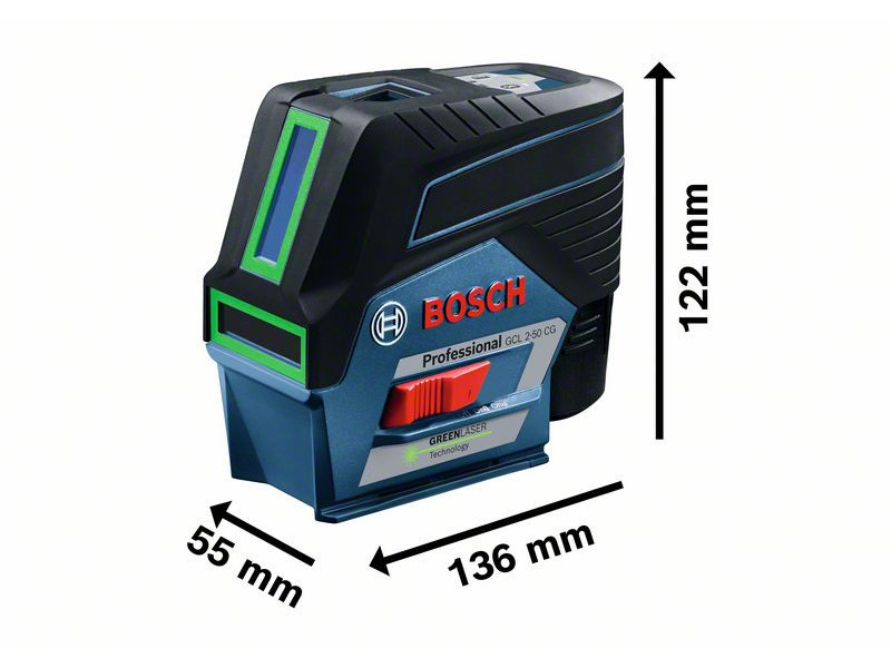 Der GCL 2-50 CG Professional Kombilaser bietet hervorragende Sichtbarkeit mit einer Reihe von intelligenten Funktionen. Die hellen grünen horizontalen und vertikalen Laserlinien sowie zwei zentrierte Lotpunkte sorgen für optimale Sichtbarkeit, und die Einstellungen können aus der Ferne über eine intelligente App mit Bluetooth®-Verbindung vorgenommen werden. Für mehr Flexibilität kann es dank der Technologie zur Nutzung von zwei Stromquellen sowohl mit einem 12V Lithium-Ionen-Akku als auch mit herkömmlichen Alkali-Batterien betrieben werden.