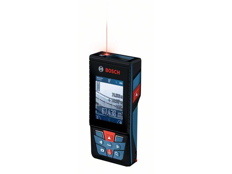 Robuster Outdoor-Laser-Entfernungsmesser mit digitaler Kamera-Sucher, Vergrößerungsfunktion für präzise Messungen von Entfernungen bis zu 150 m. Die Maße und Bilder werden automatisch gespeichert und können einfach auf dem großen, kontrastreichen 2,8"-IPS-Display betrachtet werden, das sowohl im Hoch- als auch im Querformat verfügbar ist. Für eine bequeme Dokumentation können alle Daten per Bluetooth an die Bosch MeasureOn App oder per USB-Gerät an einen Computer übertragen werden. Mit IP54-Schutz und kratzfestem Glasdisplay, benutzerfreundliche Bedienoberfläche - dieser Laser-Entfernungsmesser ist ein praktisches und vielseitiges Werkzeug für problematische Arbeitsbereiche.