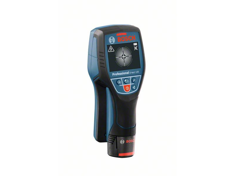 Die drei klaren Auswahltasten auf der benutzerfreundlichen Oberfläche des D-tect 120 Professional ermöglichen die Einstellung verschiedener Aufgaben. Das Gerät kann Objekte bis zu einer Tiefe von 12 cm erfassen. Akustische und optische Signale warnen den Benutzer vor im Mauerwerk erkannten Objekten.
