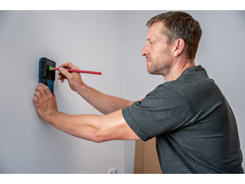 Fal fúrásakor biztosak akarunk lenni abban, hogy nem ütközünk akadályba. A GMS 100-23 Professional falszkennerünkkel a fém tárgyak és a feszültség alatt álló vezetékek egyszerűen és intuitív módon érzékelhetők. Az érzékelési eredmények színkódos jelölőlyukkal jelennek meg. Az érzékelő egyszerűen működtethető és egy móddal rendelkezik, és jelölőlyuk található rajta az érzékelt eredmények jelöléséhez. Az IP54 por és fröccsenő víz elleni védelemmel és rázkódáselnyelő gumiborítással rendelkező, strapabíró GMS 100-23 szkennert kemény munkavégzési helyszínekhez tervezték.