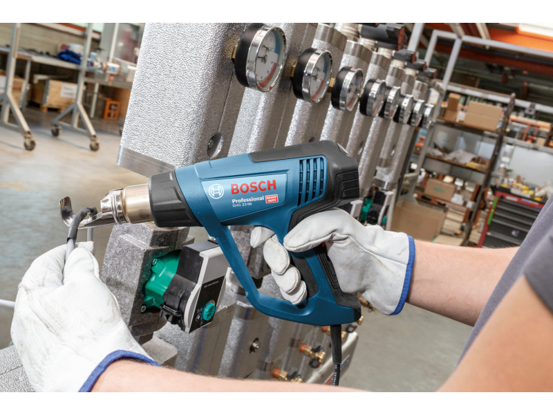 Das GHG 23-66 Professional Heißluftgebläse mit umfassender Temperatur- und Luftstromregulierung. 10 Luftstromstufen, digitale Temperatursteuerung in 10 °C-Schritten und 4 individuell anpassbare, speicherbare Programme. Diese Funktionen lassen sich leicht über das Display einstellen. Das Werkzeug erreicht leicht Temperaturen von bis zu 650 °C. Zur Verlängerung der Lebensdauer des Werkzeugs schaltet die automatische Hitzeschutzfunktion die Heizeinheit ab, während der Ventilator weiterläuft. Es verfügt über eine praktische Kühlstufe und eine stabile Kühlposition.