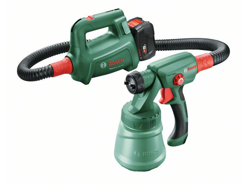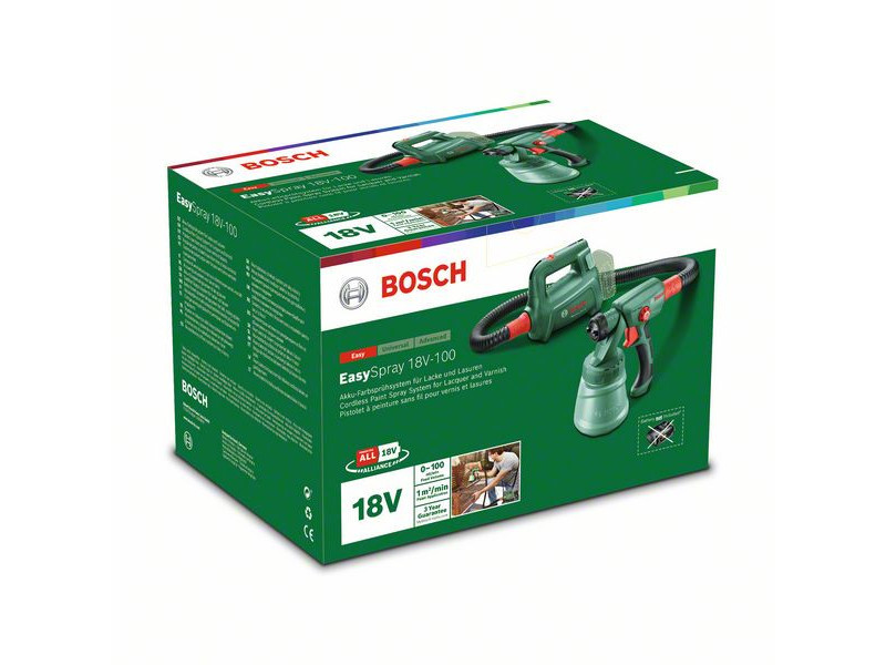 Glatte Oberflächen in Sekundenschnelle mit dem Bosch EasySpray 18V-100 Akku-Sprühgerät. Lackier- und Veredelungsarbeiten können leicht mit dem leichten, kompakten Sprühsystem des Werkzeugs und dem leistungsstarken 18V POWER FOR ALL wiederaufladbaren Akku durchgeführt werden. Perfekte Ergebnisse können auch auf unebenen Oberflächen und in engen Räumen erzielt werden, da das EasySpray 18V-100 eine gleichmäßige Beschichtung mit einer Geschwindigkeit von 1 m²/min erzeugt. Weitere Merkmale, wie die Schnellstartanleitung und der 800 ml Farbbehälter, ermöglichen eine schnellere, sauberere und angenehmere Durchführung von Heimwerkerarbeiten. Dieses Werkzeug ist Teil des POWER FOR ALL ALLIANCE Systems. Ein einziger Akku kann eine Vielzahl von Werkzeugen verschiedener Marken betreiben.