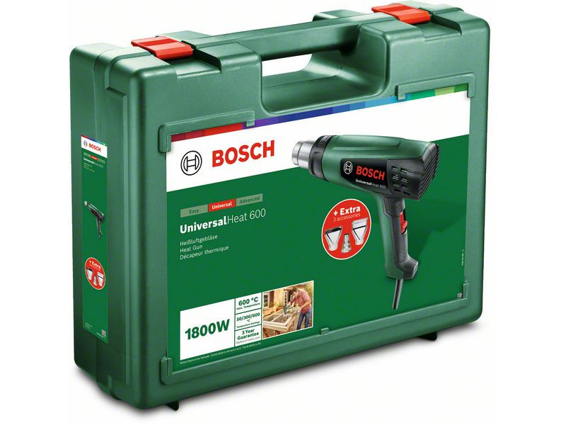 Vielseitiges Heißluftgebläse für viele Aufgaben. Dank des abnehmbaren Schutzschilds ist es auch für Arbeiten an schwer zugänglichen Stellen geeignet. Das Heizelement des UniversalHeat 600 bietet schnelles Aufheizen und gleichmäßige Wärmeverteilung für hervorragende Leistung. Darüber hinaus können mit dem dreistufigen Ein-/Ausschalter verschiedene Temperaturen und Luftströme eingestellt werden. Dank der verschiedenen Düsen kann das Heißluftgebläse für viele Aufgaben verwendet werden, wie z.B. Farbentfernung, Auftauen von Wasserrohren, Unkrautbekämpfung, Trocknen von Dichtungen, Schrumpfen von Kabeln, kreative Projekte.
