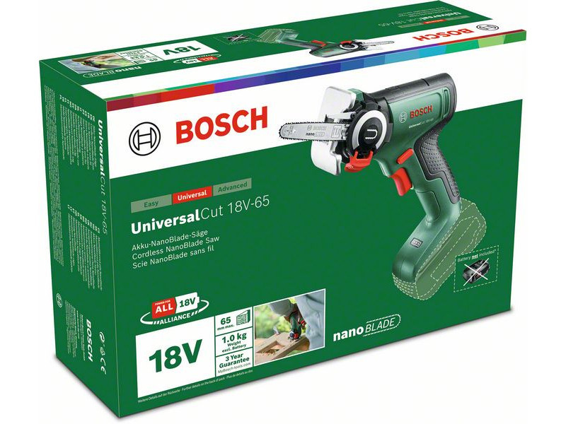 Freihandsägen war noch nie so einfach: Dank des handlichen, akkubetriebenen UniversalCut 18V-65 Werkzeugs. Mit dieser leichten und leistungsstarken Säge müssen Sie das Werkstück nicht klemmen, die Schnittlinie markieren oder andere Vorbereitungen treffen - sie kann für verschiedene Sägeaufgaben im Heim- und Gartenhandwerk verwendet werden. Optimale Ergonomie für beidhändiges Sägen - ideal für schwierigere Aufgaben. Mit der NanoBlade-Technologie ist das Sägen komfortabel und vibrationsfrei und die Sägeblätter benötigen keine Wartung. Dieses Werkzeug ist perfekt für Gerade- und Tauchschnitte in Holz, Holzwerkstoffen und Kunststoff. Die Bedienung ist einfach: Der UniversalCut 18V-65 ist mit einem einfach zu bedienenden Drehzahlregler und einem SDS-System für einen einfachen Sägeblattwechsel ausgestattet. Dieses Werkzeug ist Teil des 18V POWER FOR ALL ALLIANCE Systems. Ein Akku für alle 18V POWER FOR ALL Werkzeuge.