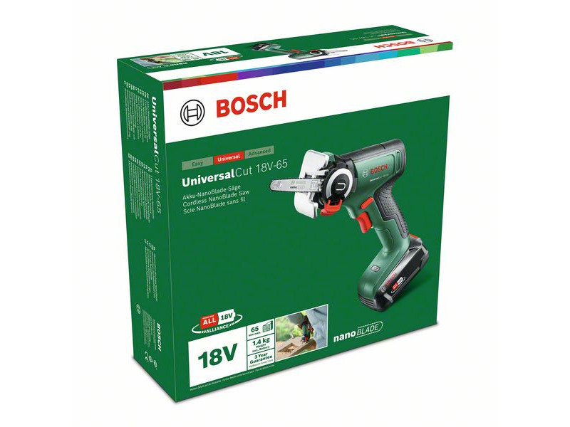 Freihändiges Sägen ist noch nie so einfach gewesen: Dank des benutzerfreundlichen, akkubetriebenen UniversalCut 18V-65 Werkzeugs. Mit dieser leichten und leistungsstarken Säge müssen Sie das Werkstück nicht einspannen, die Schnittlinie zeichnen oder andere Vorbereitungen treffen - sie kann für verschiedene Sägearbeiten bei Heimwerker- und Gartenarbeiten eingesetzt werden. Optimale Ergonomie für beidhändiges Sägen - ideal für schwierigere Aufgaben. Mit der NanoBlade-Technologie ist das Sägen komfortabel und vibrationsfrei, und die Sägeblätter benötigen keine Wartung. Dieses Werkzeug ist perfekt für gerade und Tauchschnitte in Holz, holzbasierten Materialien und Kunststoff. Die Bedienung ist einfach: Der UniversalCut 18V-65 verfügt über einen einfach zu bedienenden Drehzahlregler und ein SDS-System für einen einfachen Klingenwechsel. Dieses Werkzeug ist Teil des 18V POWER FOR ALL ALLIANCE Systems. Ein Akku für alle 18V POWER FOR ALL Werkzeuge.