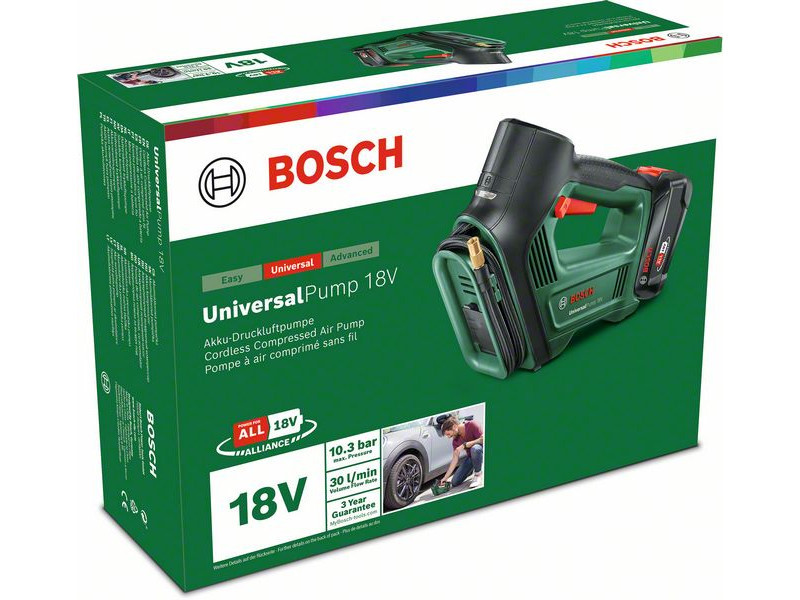Klipp und klar: Die UniversalPump 18V ist das einzige Werkzeug, das Sie für ein schnelles Aufpumpen benötigen, bis zu 30 Liter pro Minute, intuitiv zu bedienen und komfortabel. Dieses akkubetriebene Werkzeug kann überall verwendet werden, auf Autoreifen und Fahrradreifen, sowie auf anderen aufblasbaren Gegenständen, schnell einsatzbereit und einfach mit dem Finger über den Schnellstartknopf zu bedienen. Die beleuchtete Druckanzeige zeigt die Druckwerte gut lesbar an: Dies bietet insbesondere in lichtarmen Umgebungen eine komfortable Lösung. Wenn die Aufgabe erledigt ist, können alle Zubehörteile und der Schlauch direkt im Vordergrund des Geräts aufbewahrt werden. Dieses Werkzeug ist Teil des POWER FOR ALL ALLIANCE Systems. Ein einziger Akku kann eine große Anzahl von Werkzeugen verschiedener Marken betreiben.