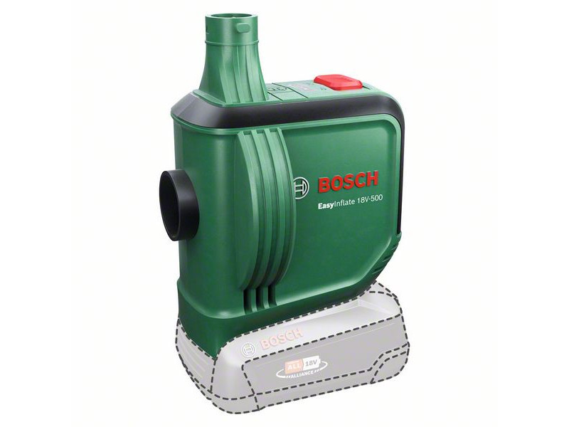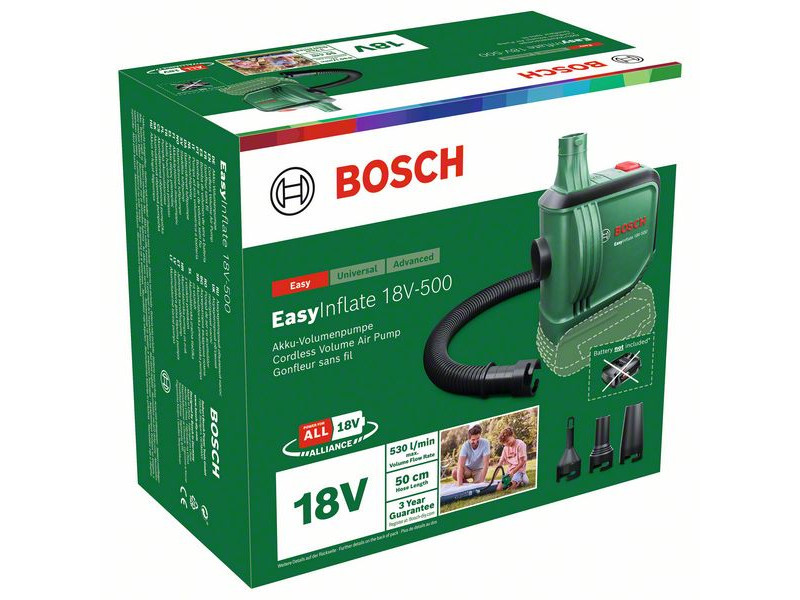 A Bosch EasyInflate 18V-500 akkus légpumpa 530 l/min maximális térfogatáramával a vízi játékok, felfújható csónakok, gumimatracok és más nagy térfogatú tárgyak felfújásának és leeresztésének sebességét új szintre emeli. Az 50 cm hosszú tömlő és az egyszerű be/ki kapcsoló kényelmes működtetést biztosít. A kompakt pumpához háromféle adapter van mellékelve a különböző méretű szelepekhez, és egy táska, amelyben minden egyszerűen elvihető a medencéhez, a tóhoz vagy a kempingezéshez. Ez a nagy térfogatokhoz alkalmas pumpa a 18V POWER FOR ALL ALLIANCE rendszer része. Egyetlen akkumulátor minden 18V POWER FOR ALL szerszámhoz.
