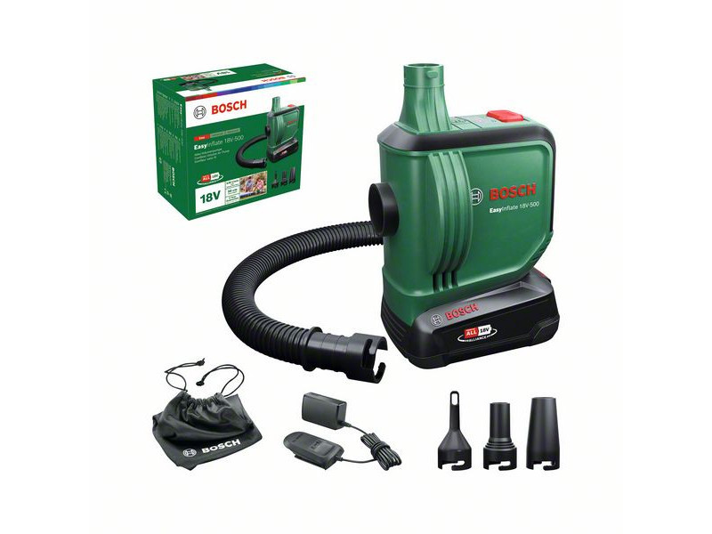 Die Bosch EasyInflate 18V-500 Akku-Luftpumpe erhöht mit ihrem maximalen Volumenstrom von 530 l/min die Geschwindigkeit des Aufpumpens und Entlüftens von Wasserspielzeug, Schlauchbooten, Luftmatratzen und anderen Gegenständen mit hohem Volumen auf ein neues Niveau. Der 50 cm lange Schlauch und der einfache Ein-/Ausschalter gewährleisten eine komfortable Bedienung. Die kompakte Pumpe wird mit drei verschiedenen Adaptern für verschiedene Ventilgrößen und einer Tasche geliefert, in der alles einfach zum Pool, zum See oder zum Campingplatz transportiert werden kann. Diese Pumpe für hohe Volumen ist Teil des 18V POWER FOR ALL ALLIANCE Systems. Ein Akku für alle 18V POWER FOR ALL Werkzeuge.