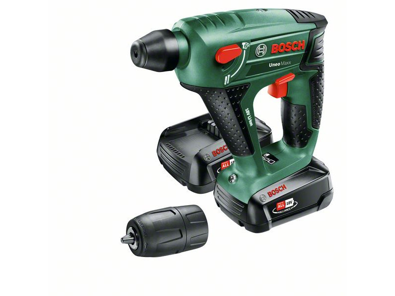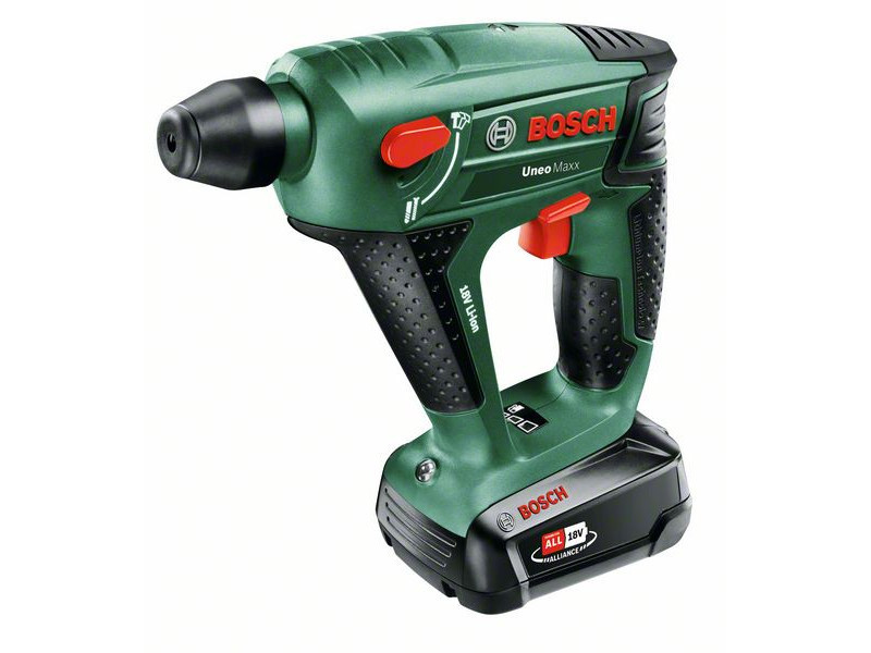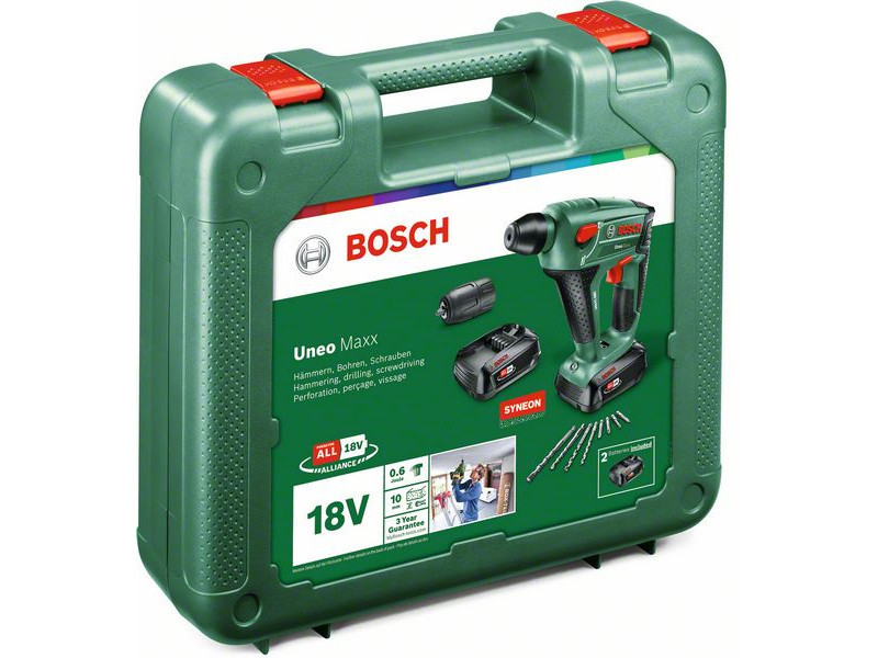 Der kraftvolle und kompakte 3-in-1-Uneo Maxx Akku-Bohrhammer wurde für die härtesten Hammerbohr-, Bohr- und Schraubarbeiten in Beton, Mauerwerk, Metall, Holz und Fliesen konzipiert. Der pneumatische Schlagmechanismus von Bosch und der starke Motor ermöglichen einfaches und schnelles Bohren in Beton, bis zu einer Tiefe von 10 mm. Es verfügt über ein SDS-System-Bohrfutter für die benutzerfreundliche Verwendung von 1/4"-Sechskant- und SDS-Quick-Bits, sowie für einen schnellen Austausch in nur 3 Sekunden. Dieser ausgesprochen leichte (1,4 kg) und kompakte Kraftprotz ist auch in engen Räumen komfortabel zu bedienen und erledigt mühelos verschiedene Aufgaben – ob Bohren in Beton oder präzises Schrauben in Holz. Dieses Werkzeug ist Teil des POWER FOR ALL ALLIANCE Systems. Mit nur einem Akku können eine Vielzahl von Werkzeugen verschiedener Marken betrieben werden.
