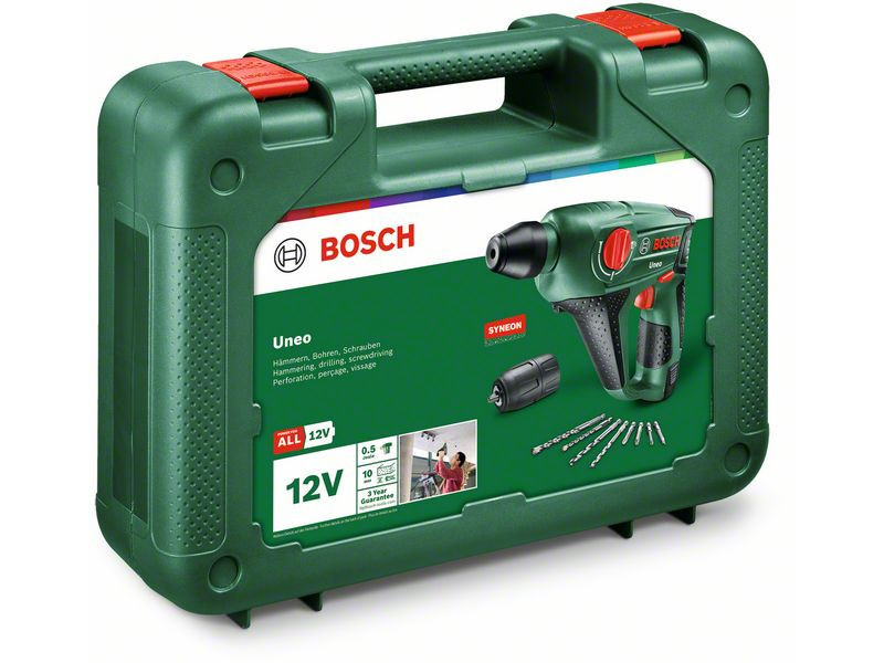 Der vielseitige Uneo Akku-Bohrhammer ist für das Hammerbohren, Bohren und Schrauben in Beton, Mauerwerk, Metall, Holz und Fliesen konzipiert. Der pneumatische Schlagmechanismus von Bosch und der leistungsstarke Motor ermöglichen einfaches und schnelles Bohren in Beton, bis zu einer Tiefe von 10 mm. Es verfügt über ein SDS-Systemfutter für die benutzerfreundliche Verwendung von 1/4"-Sechskant und SDS-Quick-Bits sowie einen schnellen Wechsel in nur 3 Sekunden. Mit den zwei Geschwindigkeitsstufen können Sie zwischen höherem Drehmoment und Geschwindigkeit für hervorragende Leistung bei jeder Aufgabe oder Material wählen. Dank seiner leistungsstarken, kompakten Bauweise kann es auch an engen Stellen eingesetzt werden und wiegt nur 1,2 kg – dieses Werkzeug ist die perfekte Wahl für jede Arbeit. Das Gerät gehört zum 12V POWER FOR ALL System. Ein einziger Akku für alle 12V POWER FOR ALL Werkzeuge.