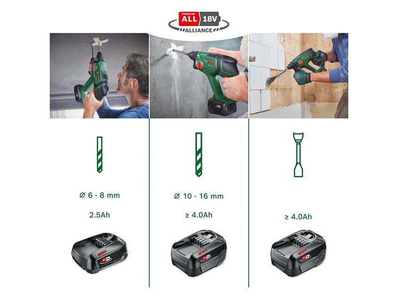 Mit diesem Akku-Kraftwerk macht sogar das Bohren Spaß: hohe Schlagkraft, einfache Bedienung, flexible Anwendung. Der pneumatische Schlagmechanismus von Bosch mit einer Schlagkraft von 2,0 J ist ideal zum Bohren von Löchern in Beton mit einem Durchmesser von bis zu 16 mm – mit einem SDS plus Bohrer. Diese beeindruckende Kraft ist auch ausreichend für das Entfernen von Fliesen und das Meißeln von Kabelkanälen. Mit diesem leichten und kompakten Werkzeug sind langwierige Arbeiten für Heimwerker weniger ermüdend. Dank der Vibrationsdämpfung und Drehzahlsteuerung vibriert das Werkzeug weniger und ist viel stabiler.