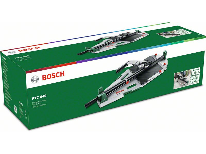 Das Schneiden großer Fliesen einfacher gemacht - der PTC 640 Fliesenschneider ist ideal für Arbeiten mit breiten Fliesen und präzisen Serienschnitten. Mit der Stützvorrichtung können große Fliesen mit einer Breite von bis zu 640 mm geschnitten werden. Serienschnitte mit außergewöhnlicher Präzision dank der Stoppfunktion des Werkzeugs. Mit der Titan-Schneidscheibe können Sie präzise ritzen, und dann können die Fliesen genau mit dem Fliesenschneider gebrochen werden - ohne die Fliesen aus dem Werkzeug entfernen zu müssen. Für Diagonalschnitte steht der 45°-Winkelführer des Geräts zur Verfügung, und für präzise Parallelschnitte kann der eingebaute Parallelführer verwendet werden.