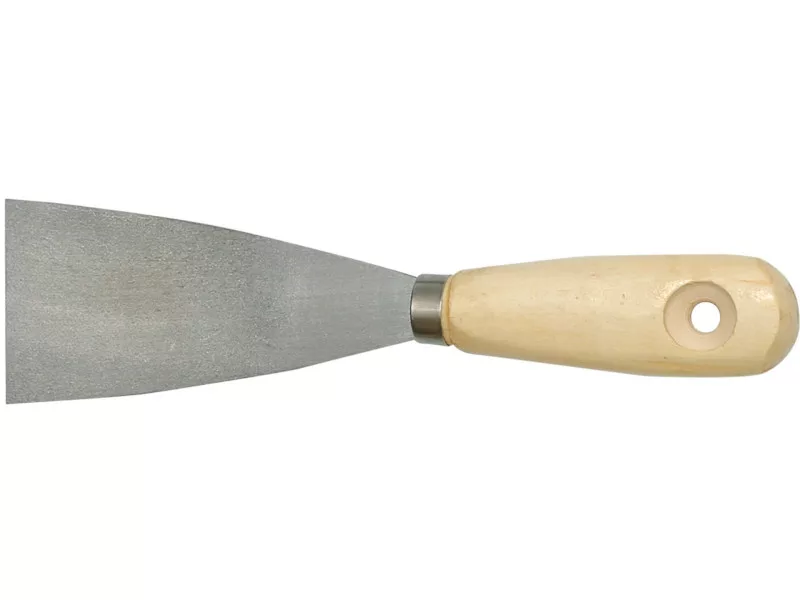 Spatula made of resilient sheet metal. With a classic wooden handle, covered with a layer of clear varnish.