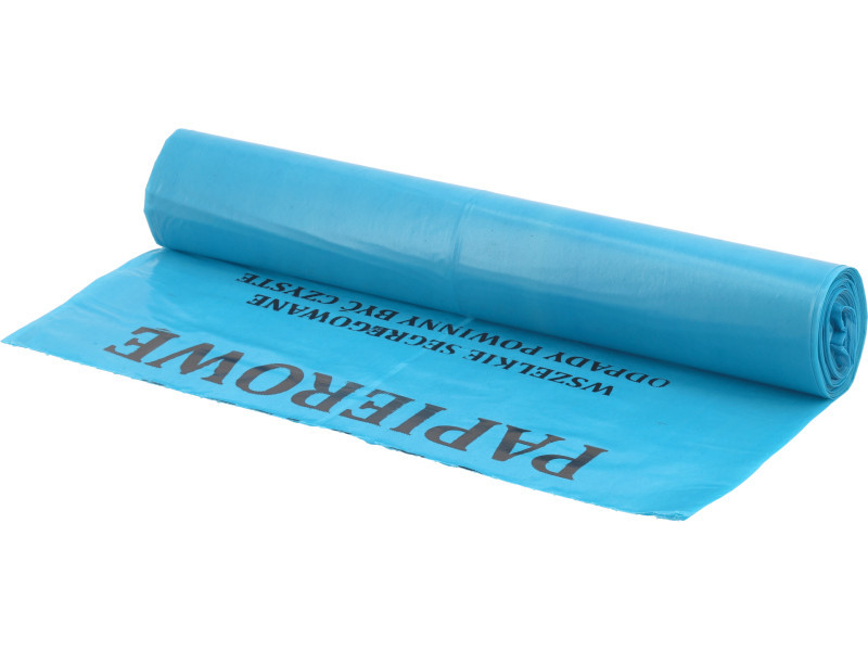 120 l waste bags. Made of strong 0.040 mm thick film, 1.10 m high and 0.70 m wide. One package contains 10 bags with adequate resistance to abrasion and with a strong, accurately made seal. Blue-colored product designed for discarding books, magazines, notebooks, paper bags, cardboard boxes, printer paper, wrapping paper, etc. The collected waste regardless of its type should be clean. Before disposing of paper, remove all staples, staples or other metal or plastic elements. Designed for disposal of books, magazines, notebooks, paper bags, cardboard boxes, printer paper, wrapping paper, etc. 120L WASTE BAGS 10 PACKS.