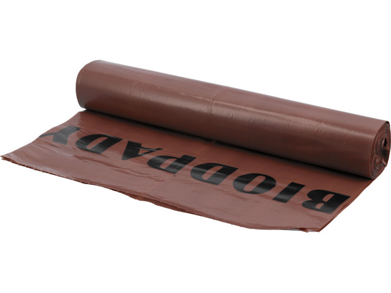 120 l waste bags. Made of strong 0.040 mm thick film, 1.10 m high and 0.70 m wide. One package contains 10 bags with adequate resistance to abrasion and with a strong, accurately made seal. The brown-colored product is designed for discarding fruit and vegetable waste, egg shells, small parts of plants, clean sawdust, etc. Do not dispose of meat waste, bones, ashes, fat.