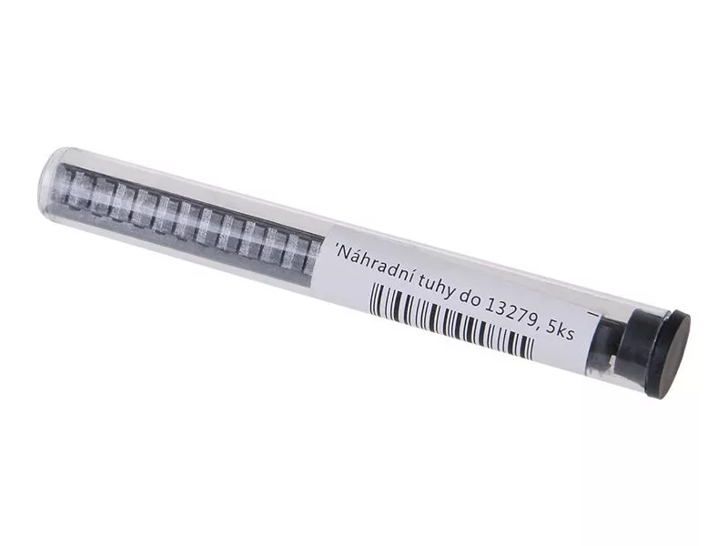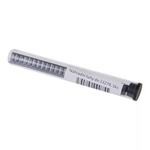 A csúcs kb. 5 mm hosszúságú szegmensekre van osztva, amelyek az eltompultság után letörnek és egy éles pontra térnek vissza. A ceruza klasszikus keménysége - HB. Műanyag védőcső 5 tartalék csővel.