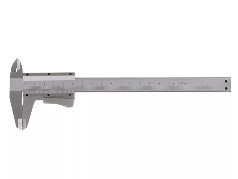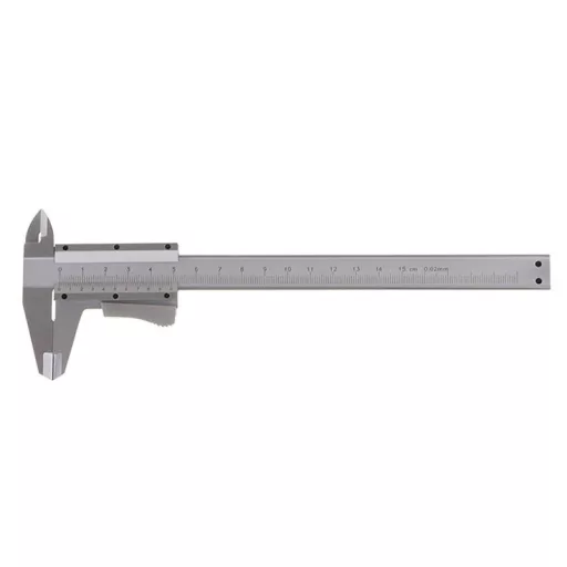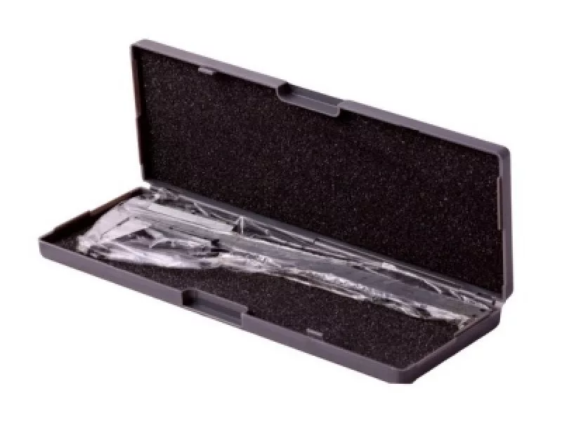 Tolómérő 0 - 150 mm 0,02 mm-es pontossággal, metrikus skála mm-ben, mélységmérő, kiváló minőségű rozsdamentes acél, precíz megmunkálás, gördülékeny mozgás, nyomógombos reteszelés, egységátalakító asztal, műanyag tok.