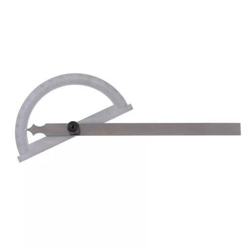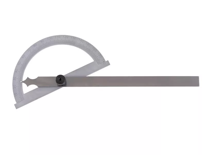 Szögmérő forgókarral, szög alaphossz 150mm, forgókar hossza 200mm, 0 - 180°, lehetőség a mért szög rögzítésére az átvitelhez. Rozsdamentes acél, bőr tok.