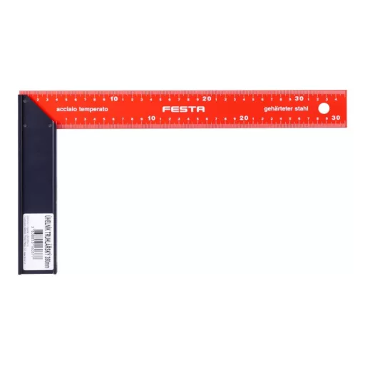 Asztalosszög, minőségi kidolgozás és anyagok (edzett rugóacél, tartókar feketére eloxált alumíniumból), skála mm-ben, pontosság 0,5mm/m.