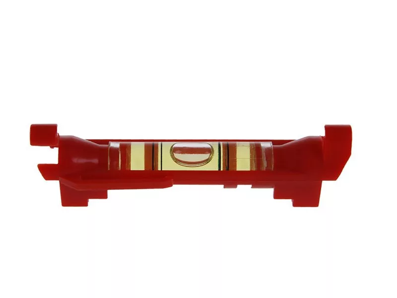 Kis műanyag vízmérték, két horoggal a madzagra akasztáshoz, extra könnyű kivitel a megereszkedés megakadályozására. Övcsipesz, zsebre. V-horony kerek csövek vízszintes helyzetének mérésére.