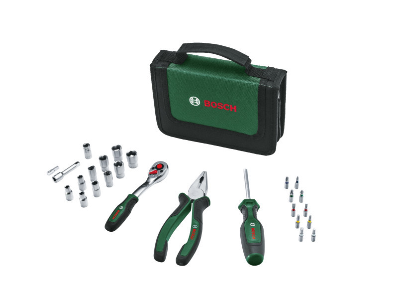 26-teiliges Set mit ¼-Zoll-Ratsche, Kombizange, universellem Schraubendreher, Bits usw.