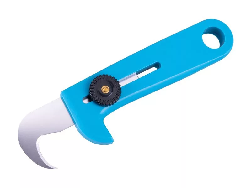 Műanyag kés kampós pengével, strapabíró csavaros zárral, a penge biztonságos tárolása a kés nyelében, alkalmas padlóra, bőrre, textilre... .
