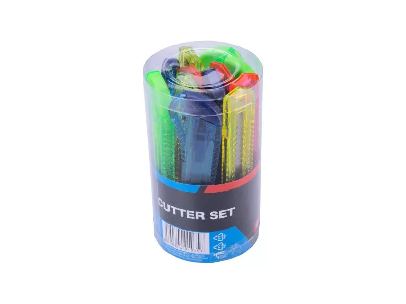 Műanyag bontókés készlet 18 mm, 12 db, műanyag kerek doboz, színkeverék.