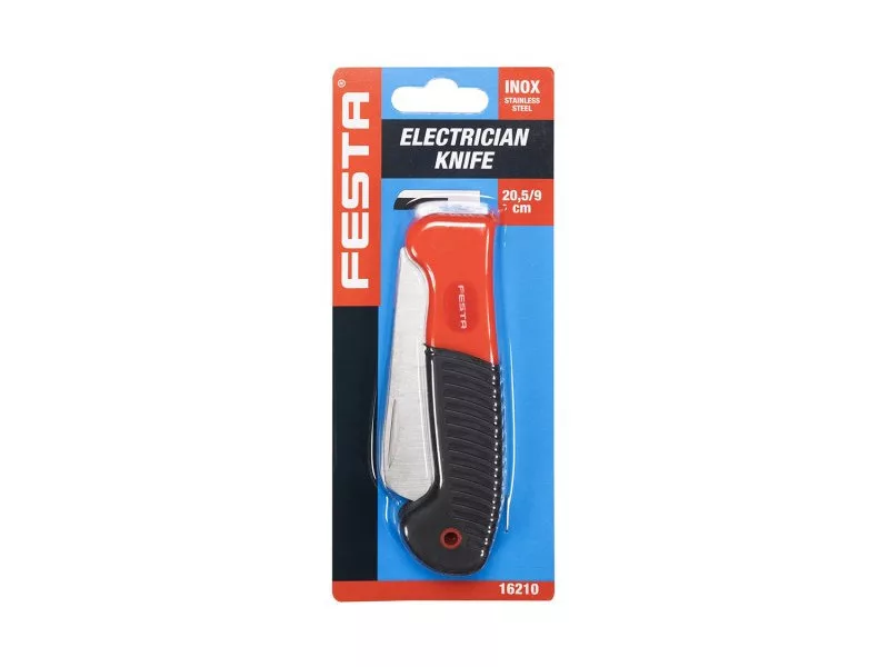 Abschließendes Elektrikermesser mit gerader Klinge, starke Klinge mit doppelter Schneide erleichtert das Abisolieren von Kabeln, gummiertem ergonomischen Griff, Luftpolsterfolie.