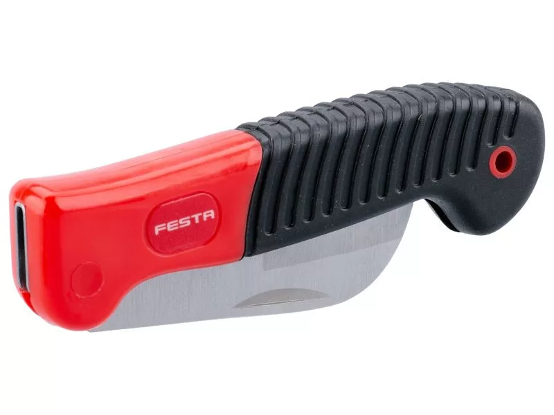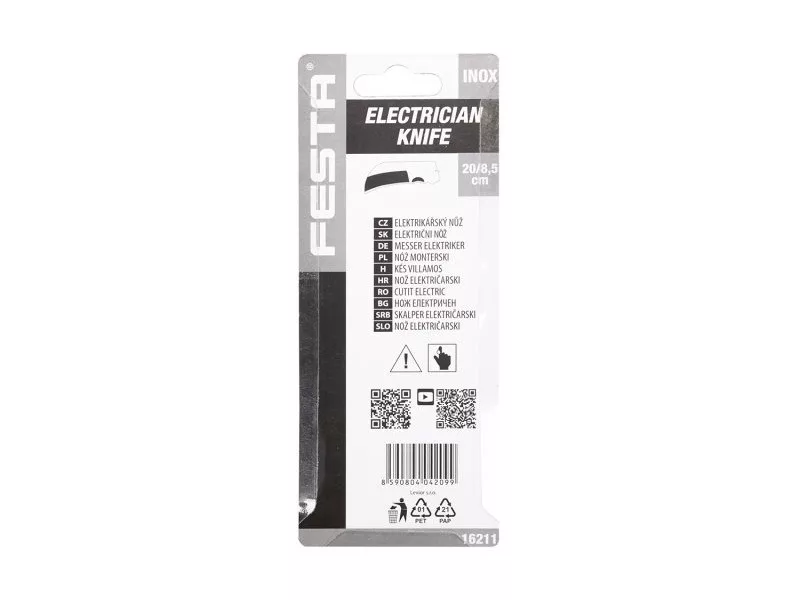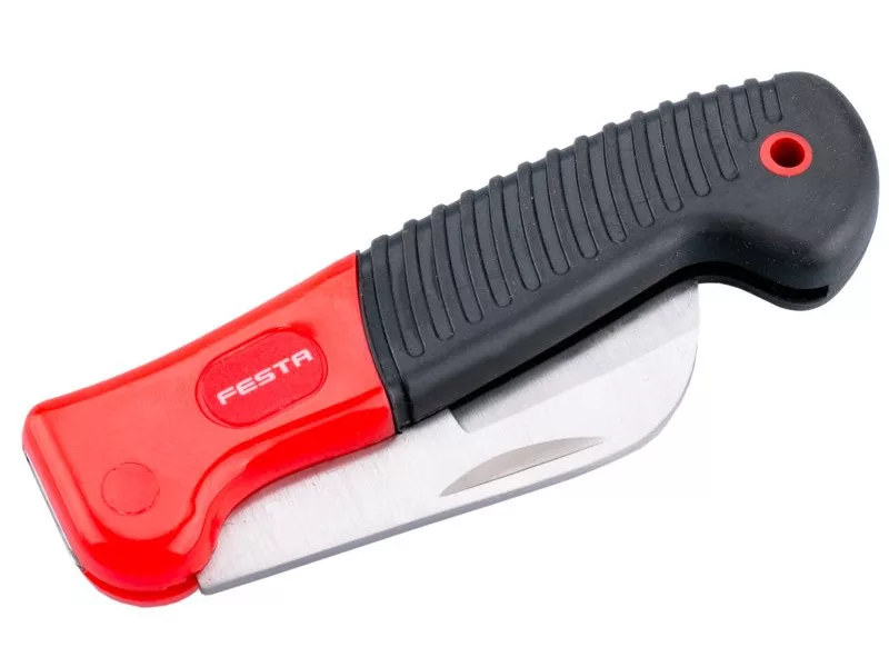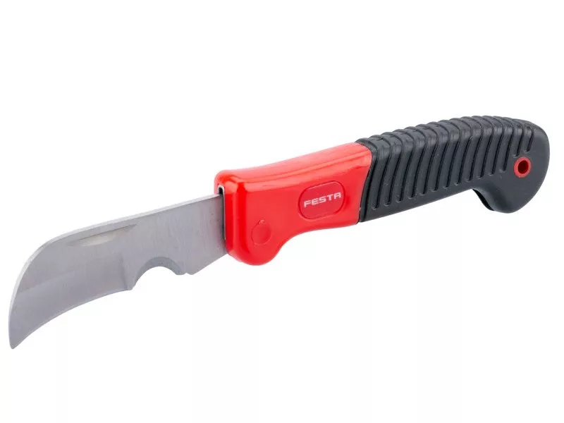 Záró villanyszerelő kés ívelt pengével, erős penge dupla éllel a vezetékek csupaszítását megkönnyítve, gumírozott ergonomikus nyél, buborékfólia.