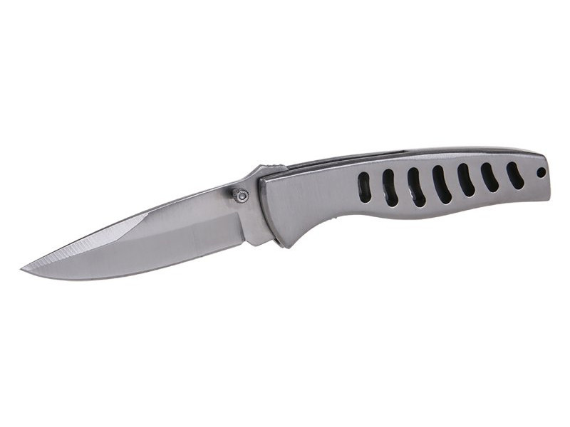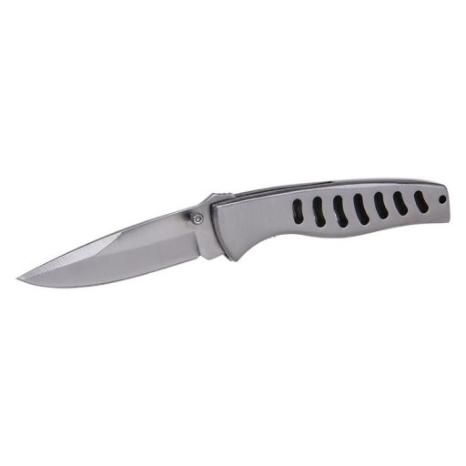 Összecsukható zsebkés, könnyű alumínium nyél, egykezes nyitás, rozsdamentes acél penge, kiváló minőségű szegecselés, pengehossz 105 mm, buborékfólia.