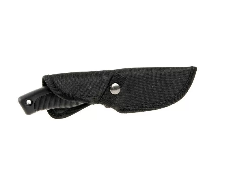 Rozsdamentes vadászkés, a penge teflon felületkezelése, teljes hossza 23 cm, ergonomikus gumírozott nyél. A kés nem összecsukható. Nylon tok övcsipesszel.