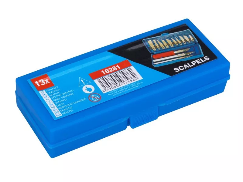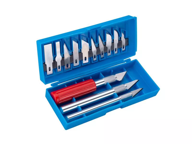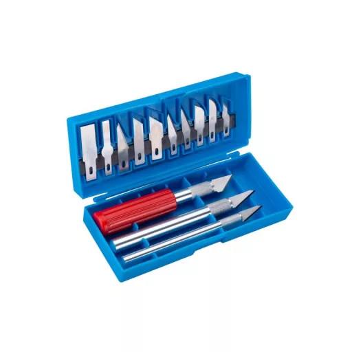 Többfunkciós szike készlet - kések, ergonomikus markolat gyorsszorító pengetartóval, széles felhasználási lehetőség modellkészítésben, faragásban, iparban, műanyag dobozban.