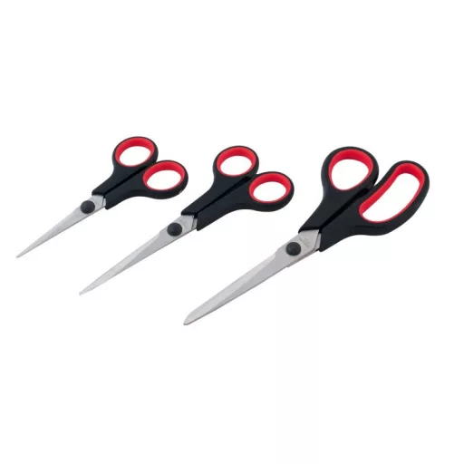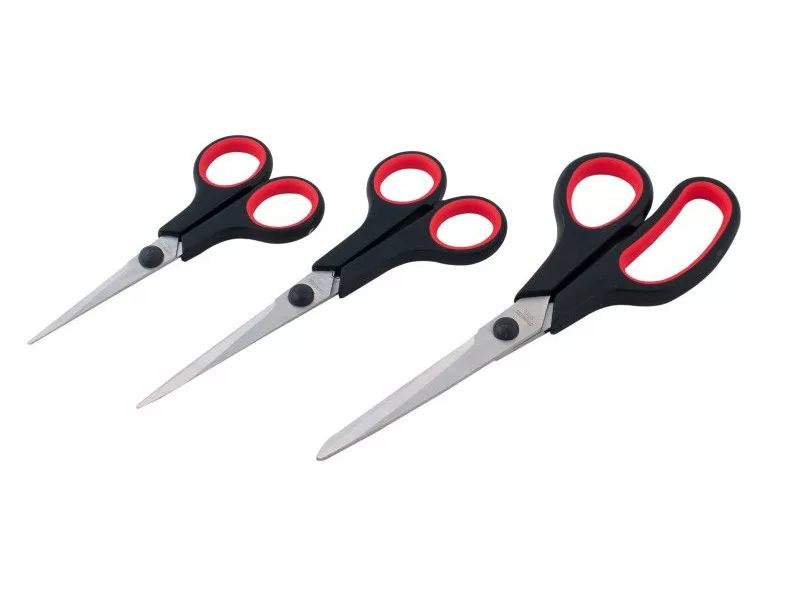 Dreiteiliges Scherenset in guter ergonomischer Ausführung, geeignet für Büro- und künstlerische Anwendungen.