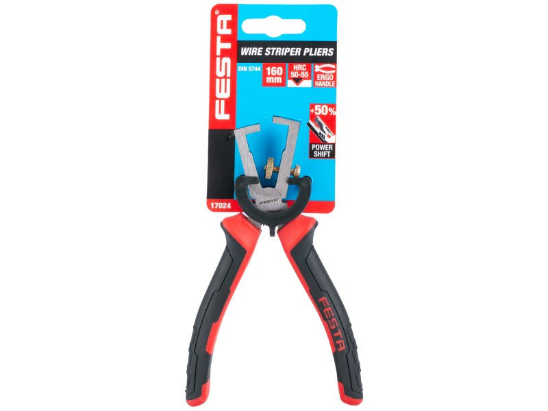 FESTA 160 mm-es csupaszító fogó, állítható pofák a könnyű huzalcsupaszításhoz, ergonomikus fogantyúk, tanúsítvánnyal 1000 V-ig, gyártó ISO 9001 tanúsítvánnyal, buborékfólia.