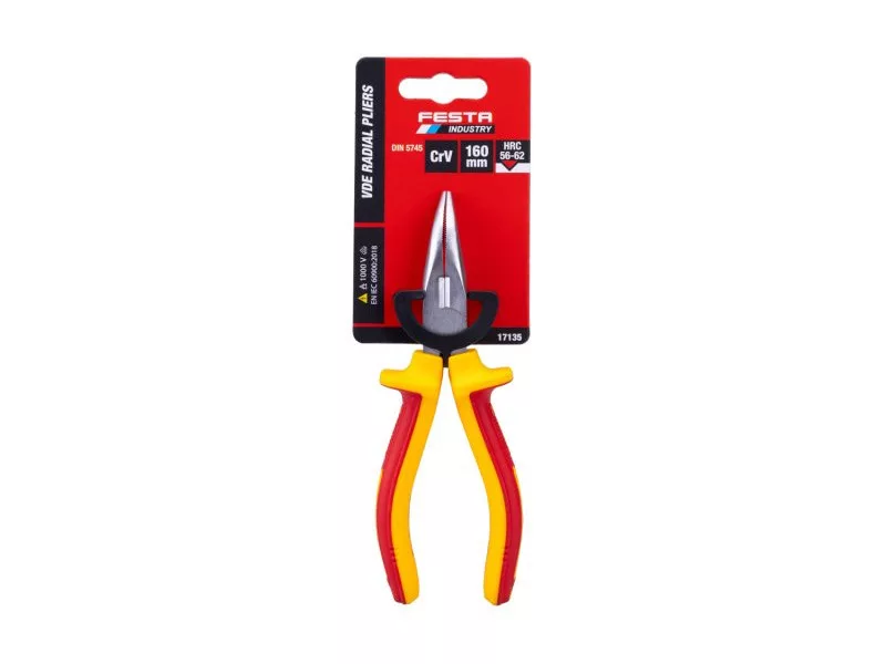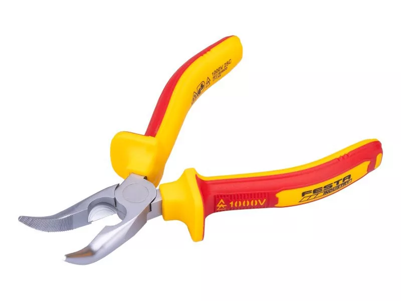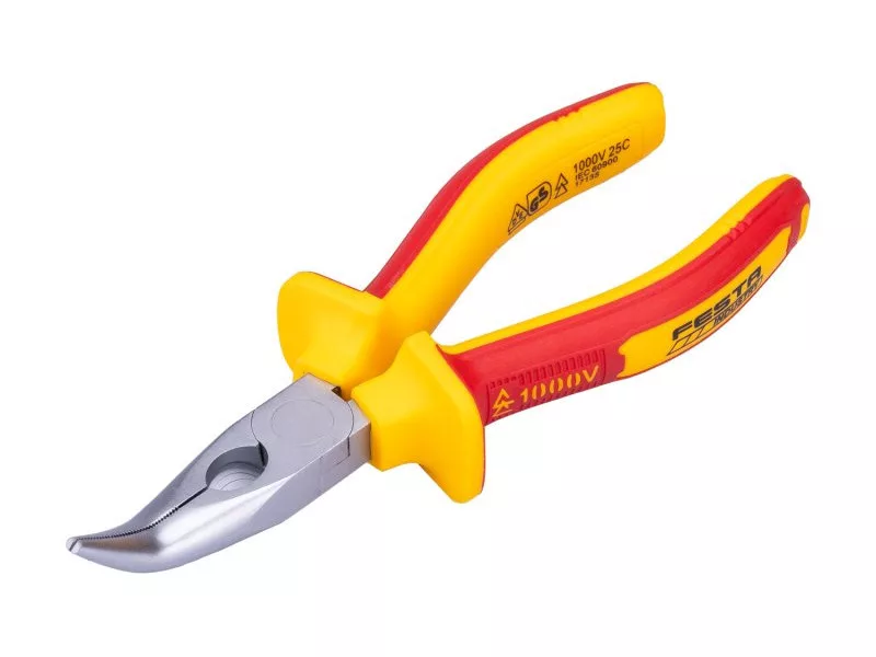 A FESTA VDE rádiós hajlított 160 mm-es fogók elektro VDE 1000 V, IEC/EN 60900-2004 tanúsítvánnyal rendelkeznek, a polipropilén és a gumi kombinációja az ergonomikusan kialakított nyélen kiváló csúszásgátló tulajdonságokat és jó kenőanyagokkal és vegyszerekkel szembeni ellenállást garantál. Megfogópofák különösen kopásálló, króm-vanádium nagy teljesítményű acélból. Súlya 0,233 kg.