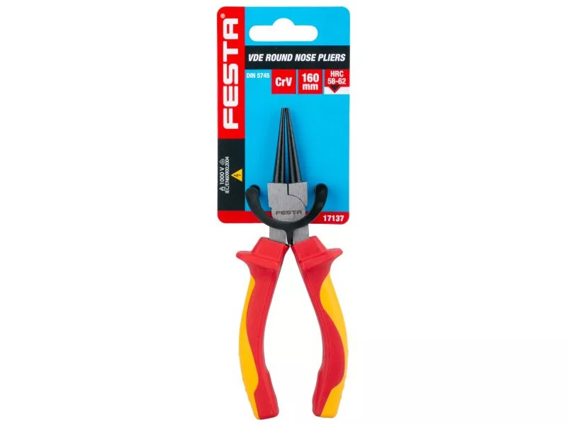 A 160 mm-es FESTA VDE fűzőlyukú fogók elektro VDE 1000 V, IEC/EN 60900-2004 tanúsítvánnyal rendelkeznek, a polipropilén és a gumi kombinációja az ergonomikusan kialakított fogantyúkon kiváló csúszásgátló tulajdonságokat és jó kenőanyagokkal és vegyszerekkel szembeni ellenállást garantál. Megfogópofák különösen kopásálló, króm-vanádium nagy teljesítményű acélból. Súlya 0,233 kg.