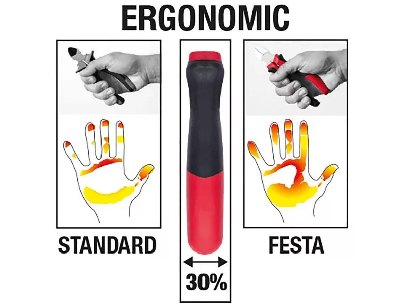 Kiváló minőségű fogó. Korróziógátló kezelés. Ergonomikus kétkomponensű puha fogantyúk. 30%-kal több érintkezés a fogantyúval, csökkentve a szükséges erőt. A gyártó rendelkezik az ISO 90001 HRC 58-62 tanúsítvánnyal.