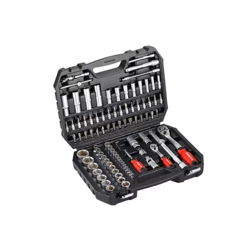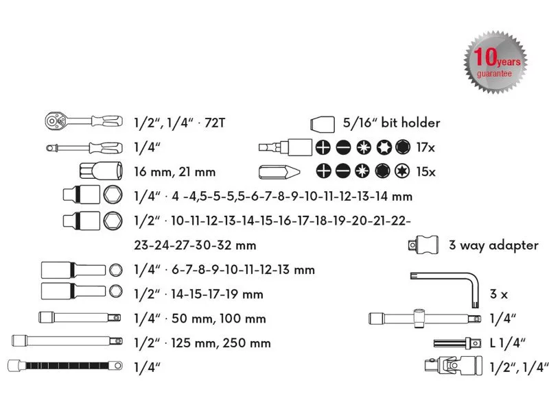 A kiváló minőségű gola készlet a felhasznált anyagok minősége és a professzionális autóműhelyben vagy szervizben történő feldolgozás miatt megfelelő. 10 év garancia. Minden alkatrész kiváló minőségű króm-vanádium acélból készül. Nikkel bevonat. A fúróhegyek S2 ötvözött acélból készültek. A racsnis 72 fogas finom felosztású, a racsnis teste CrV acélból, a fogszerkezet S2 acélból készült, a fogantyú pedig ergonomikus kialakítású, ártalmatlan gumival. Új kialakítású, elsődleges anyagból készült műanyag tok fém záródással és fedél zsanérokkal.