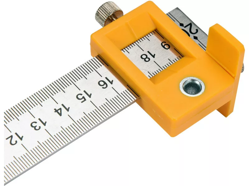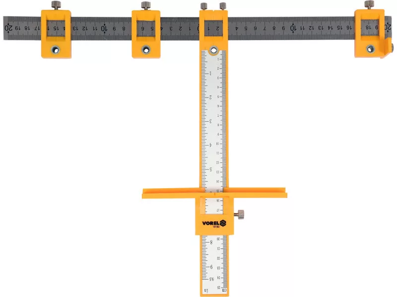 Template for determining drilling points. Horizontal frame is made of steel sheet with permanently applied with a millimeter and inch scale, length 200 +200 mm. Three movable, mounted markers can be blocked on the strip. A 250 mm vertical strip and a parallel limiter were made of ABS plastic, a strip equipped with a metal insert with a millimeter and inch scale. The device is packed in a protective, textile cover. The device is intended for precise designation of drilling points, it gives the possibility of quick transfer of points without having to re -dimension.