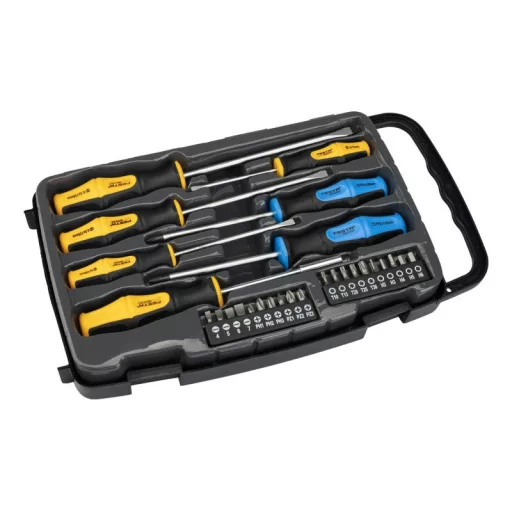 Csavarhúzó készlet bitekkel 27 db. S2 ötvözött acél, mágneses vég, ergonomikus kétkomponensű lágyított fogantyú. A készlet tartalma: 3x laposcsavarhúzó, 3x Phillips csavarhúzó, 1x csavarhúzó bitekkel, 20x csavarhúzó.