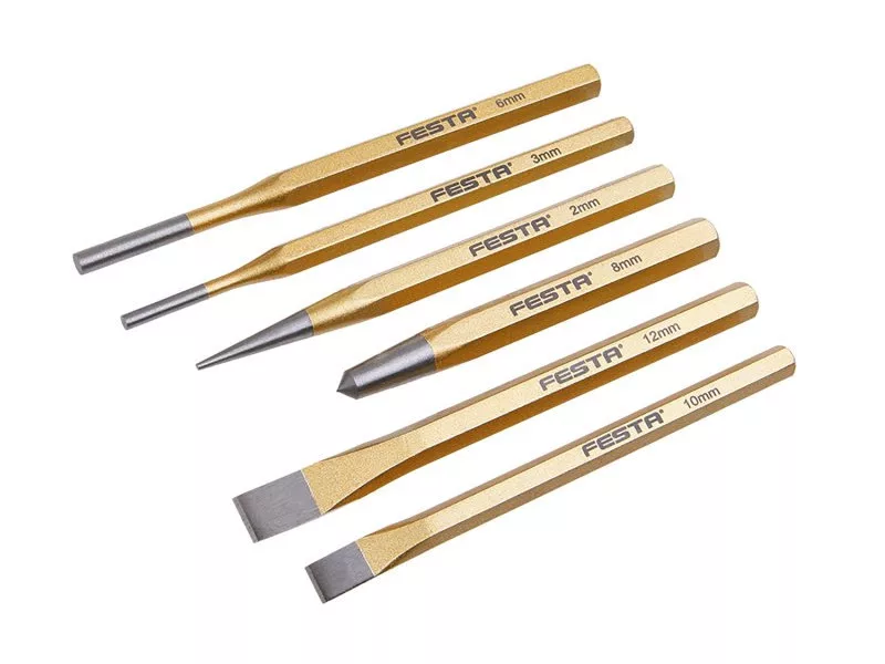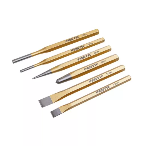 Vésők, vésők és lyukasztók FESTA készlet króm-vanádium acélból. A készlet 6 db vésőt tartalmaz: 2x140, 8x115mm, véső: 12x152, 10x142, lyukasztó: 3x152, 6x152.