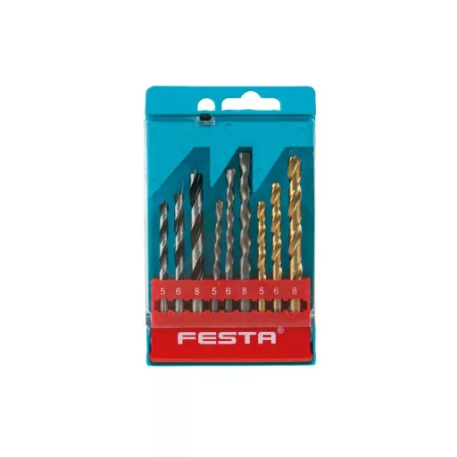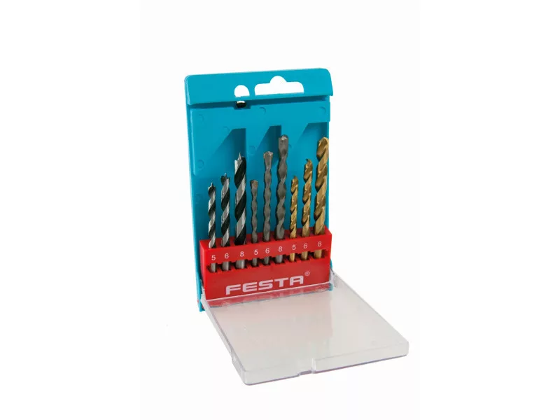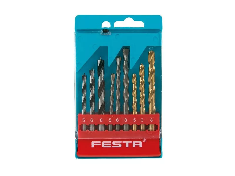 FESTA fúrószár készlet fához, falazathoz és fémhez 5, 6 és 8 mm átmérőben, hengeres szárral. Minőségi anyagok és kivitelezés. A TiN bevonatú fémfúrók rozsdamentes anyagokhoz is használhatók. Praktikus műanyag csuklós dobozba csomagolva.
