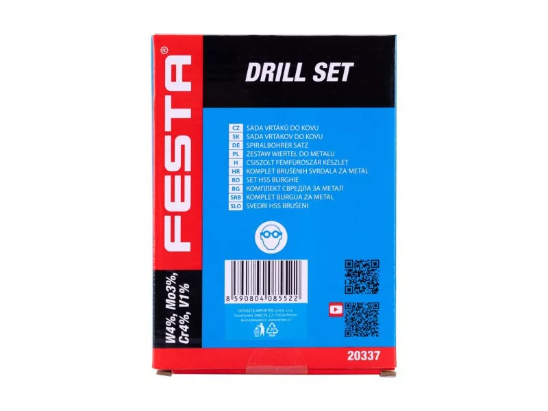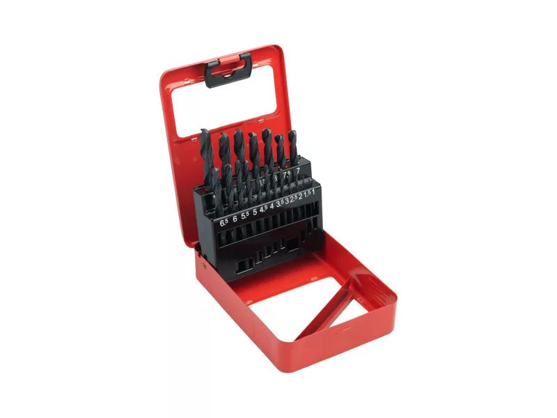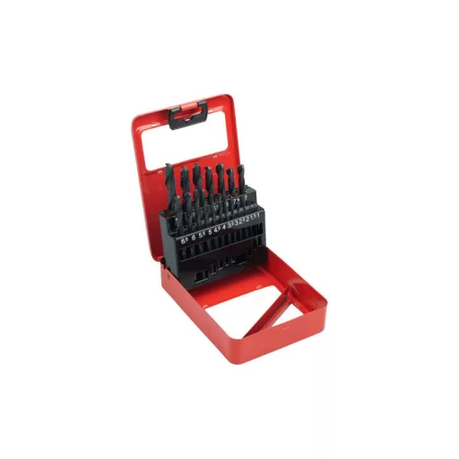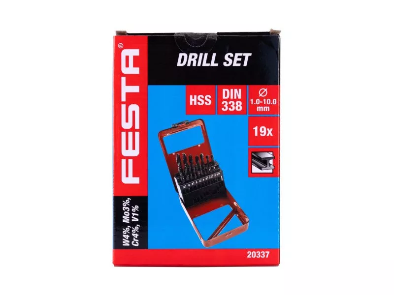 HSS fémfúró készlet, amely megfelel a DIN 338 szabványnak, a fúrók kiváló minőségű gyorsacélból (HSS), volfrám 4%, molibdén 3%, króm 4%, vanádium 1%. 19 db-os készletben, átmérő 1,0 - 10,0 mm.