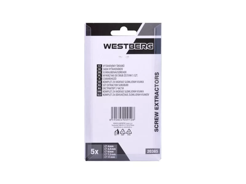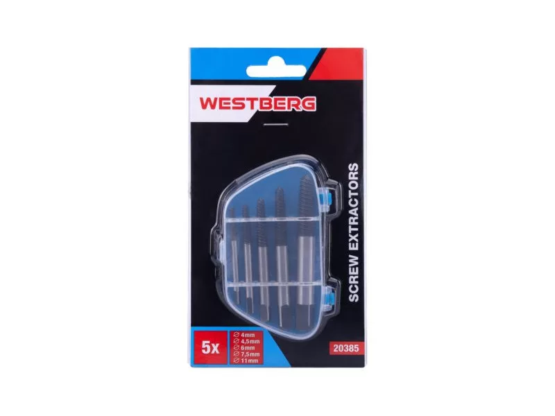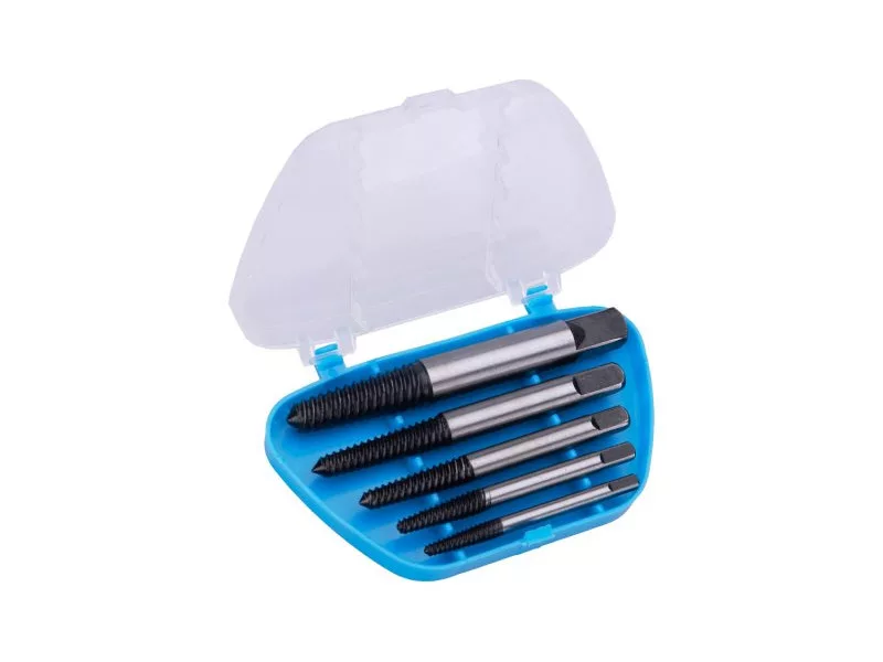 5 részes csavarkihúzó készlet hobbi használatra, felhasználása: törött és meghajlott csavarok, menetes rudak kihúzásához..., előfúrás szükséges, az ellentétes csavarvonalnak köszönhetően fokozatosan a furatba fúrva a hajlított rész lecsavarható vagy kifordítva, méretek: 4, 4,5 , 6, 7,5, 11 mm, praktikus műanyag doboz a tároláshoz.